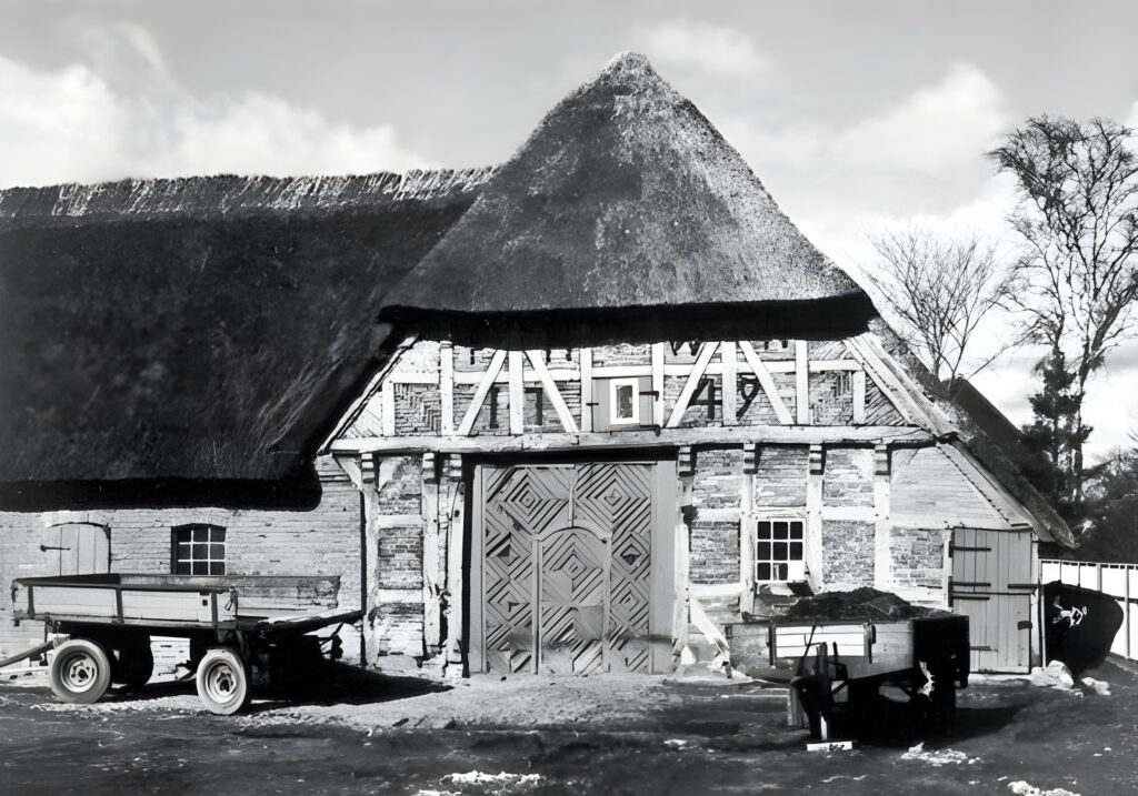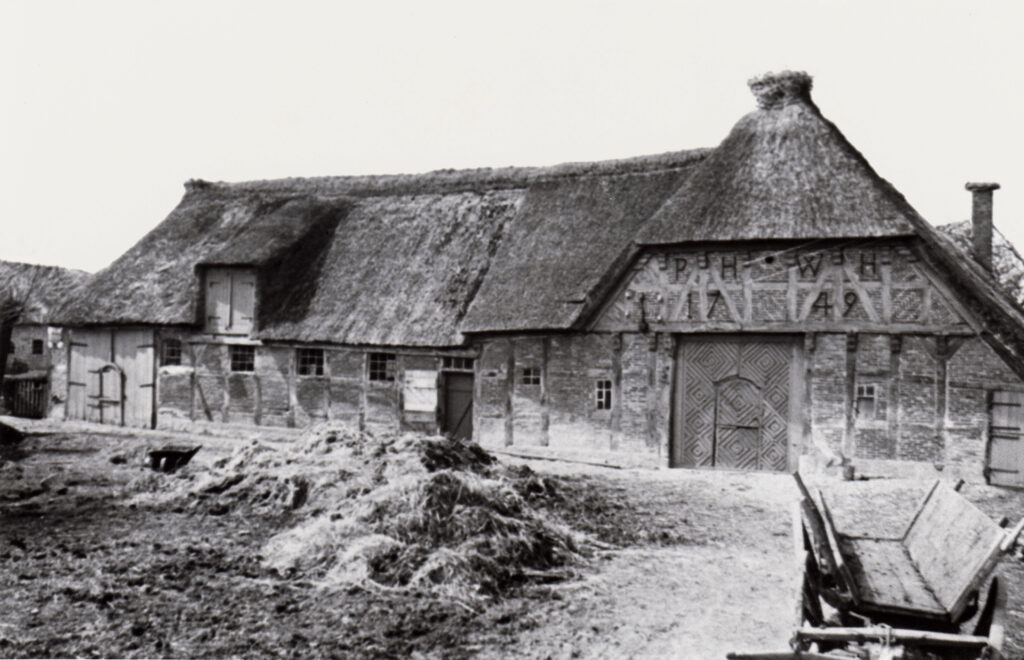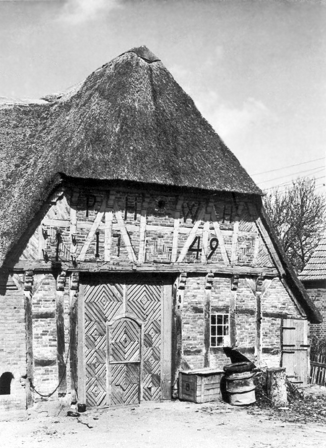 Fachhallenhaus mit späterem Seitenflügel, Torgiebelwand in reich ausgebildetem Fachwerk. Tor mit kräftig profiliertem Rhombenmuster. Im Giebel Füllziegelmuster.